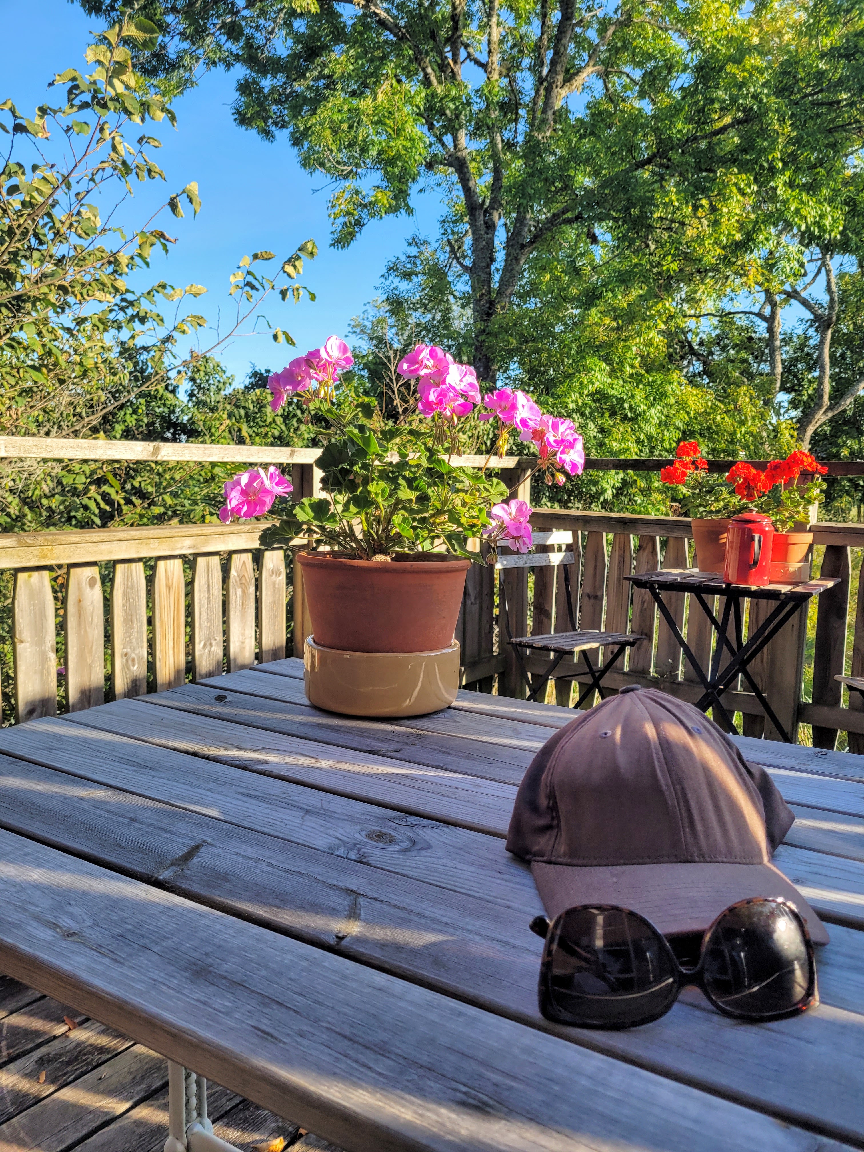 Just nu verkar det inte regna, bordet på altanen är min ”regnmätare”. Men det är blåsigt, och ser kulet ut därute. Skönt med spisvärmen. Blöta jägare återvänder från skogen när klockan är snart halv tre. Jag rensar räkor och hårdkokar ett ägg till kvällen. Och kommer än så länge ihåg att fylla på ved i spisen.