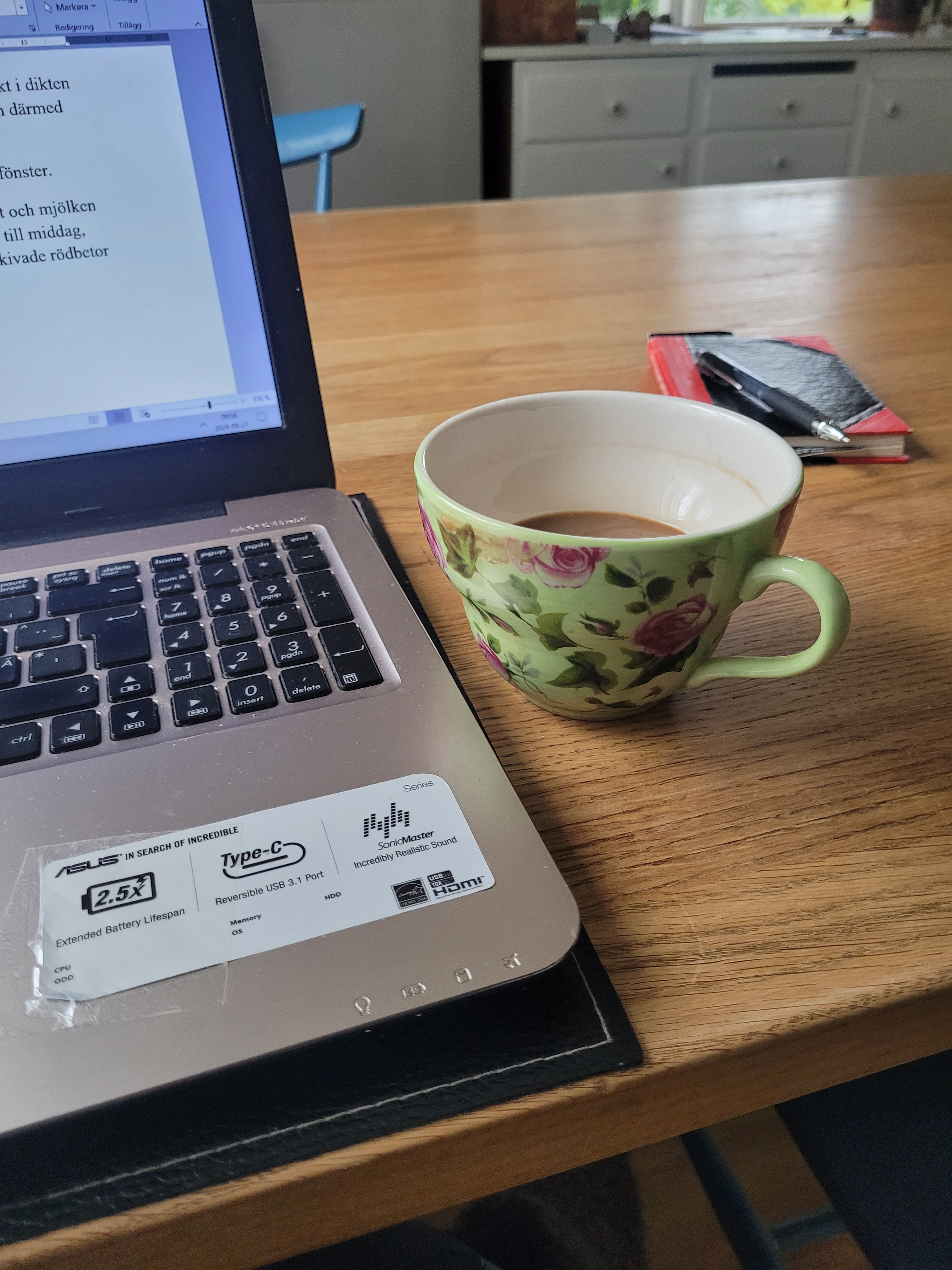 Fint att höra (jo, det hör jag) vedspisens sprakande när den brinner som den ska. Jag har ätit lunch och är inte längre hungrig. Räkorna kanske går åt till kvällen ändå. Just nu tinar de. Icas lösfrysta stora räkor, bästa sortens frysta räkor. Bättre än de ynkligt små färska som tycks vara de enda som säljs numera.
