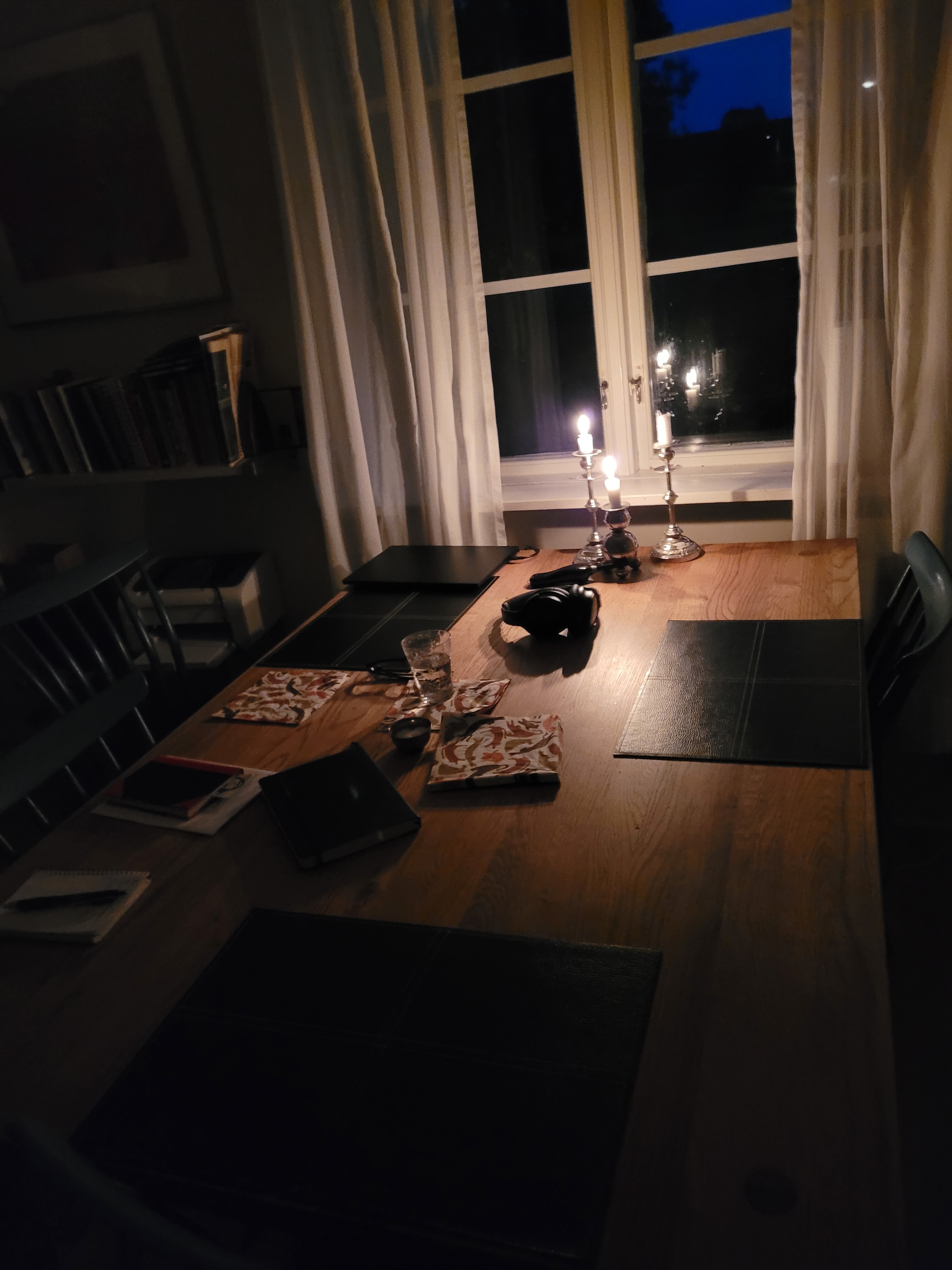 Jag har spritt ut ett antal pinaler som jag tror att jag måste ha med mig, här och där i huset. Allt ifrån batterier till värmeljus och tre sådana där fula, men praktiska, Ikea-ljushållare i glas. Två ljusstakar till batteriljusen, förpackning att stoppa tillbaka batteriblockljuset i för transport. Ett par mjuka gamla herrnäsdukar att torka glasögon med. En diskhandduk, ifall sådana inte finns. Några Wettex-dukar. Bokmärken, anteckningsböcker, tändare till gas och ljus. Pennor, med mera ditåt som ryms i pennfodral (som en gång innehöll Jans ”compression socks”; bra förpackning med draglås). Post-it-lappar (bara några).