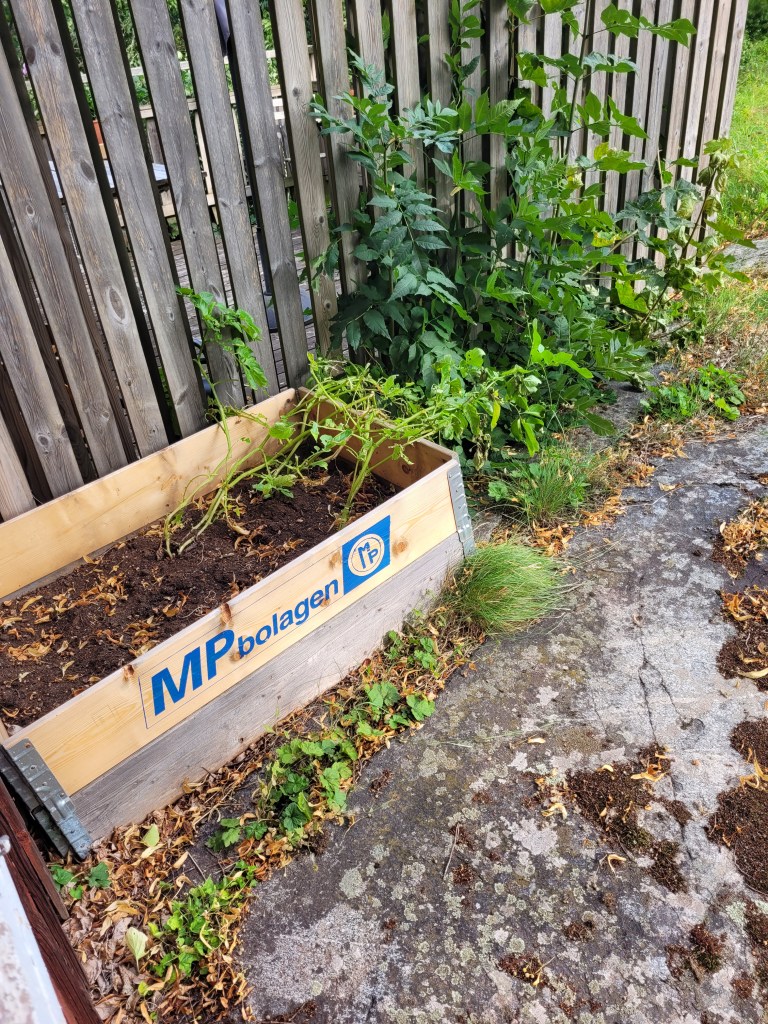 Nu inne, middagen blev resterna från igår. Mina fantastiska potatisar är upptagna, några ska jag äta i morgon till sillen jag skulle ätit idag. Tur jag tog upp dem (tror jag, okunnig som jag är) – ett par var väldigt stora. Låter den här blasten ligga kvar i pallen över vintern, bär kanske dit lite löv och sådant också när de börjar falla. Har inte räknat potäterna, men med ett pris/kilo på 26-27 kronor, har jag nog fått tillbaka det sättpotatisen kostade, 109 kronor. Och lite odlarnöje och glädje på köpet.