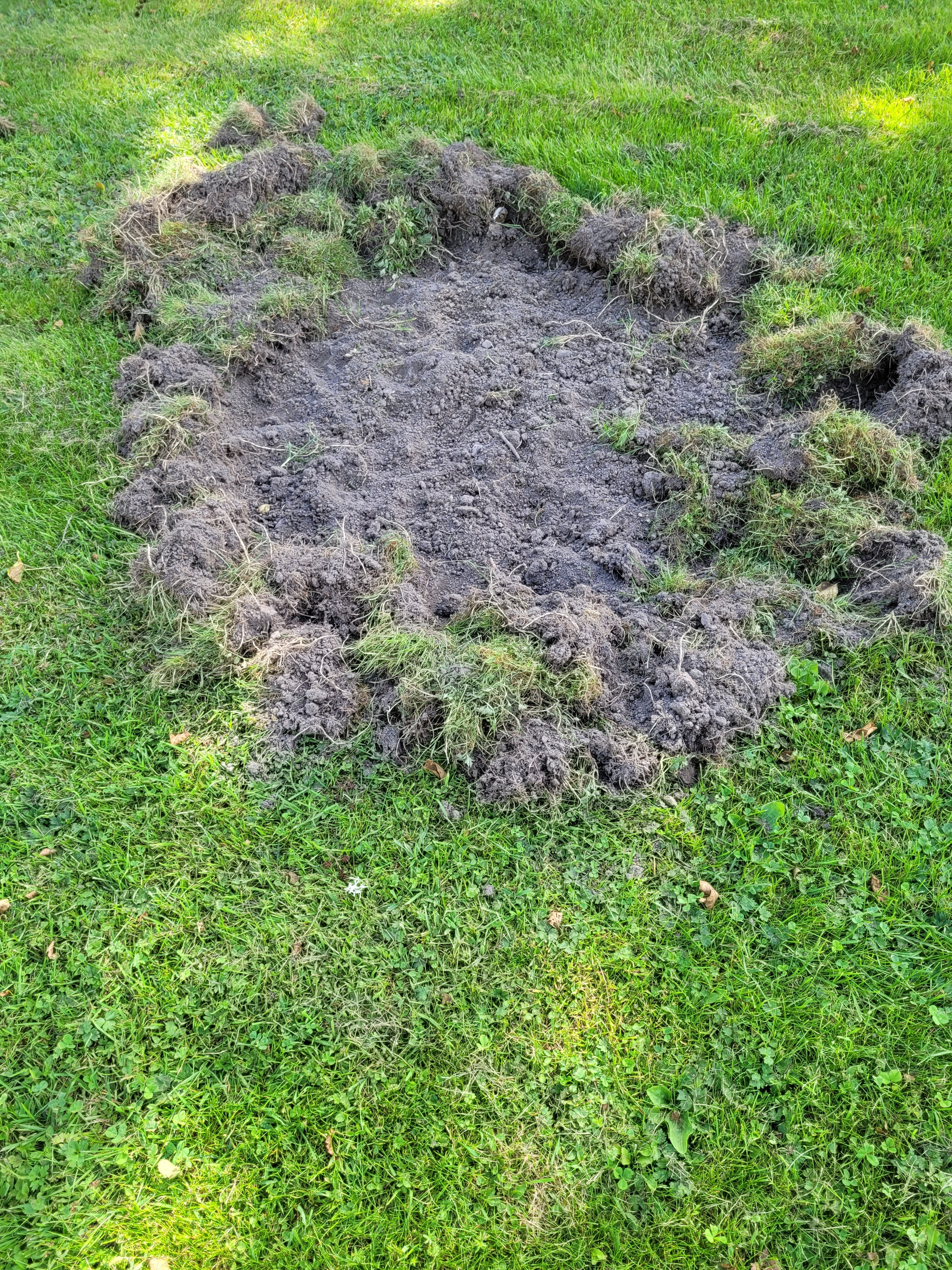 I fredags fixade Mischa till gräset där vildsvinen bökat. I morse syntes det att de varit där igen. Varför sitter ingen av gårdens jägare på pass under nätterna? Det kan inte vara svårt att se grisarna och skilja på ålder och kön, gräsytan ligger öppet. Kanske arrangeras en stor jakt i höst, det har skett tidigare. När jag hämtade tvätten såg jag att någon gris nog har varit över på min sida också, där gräset redan var skadat av gårdens flitiga gräsklippare. Efter vägen ner till sjön har också nya gropar ”uppstått” under natten. Se bild, det är bara en av dem.