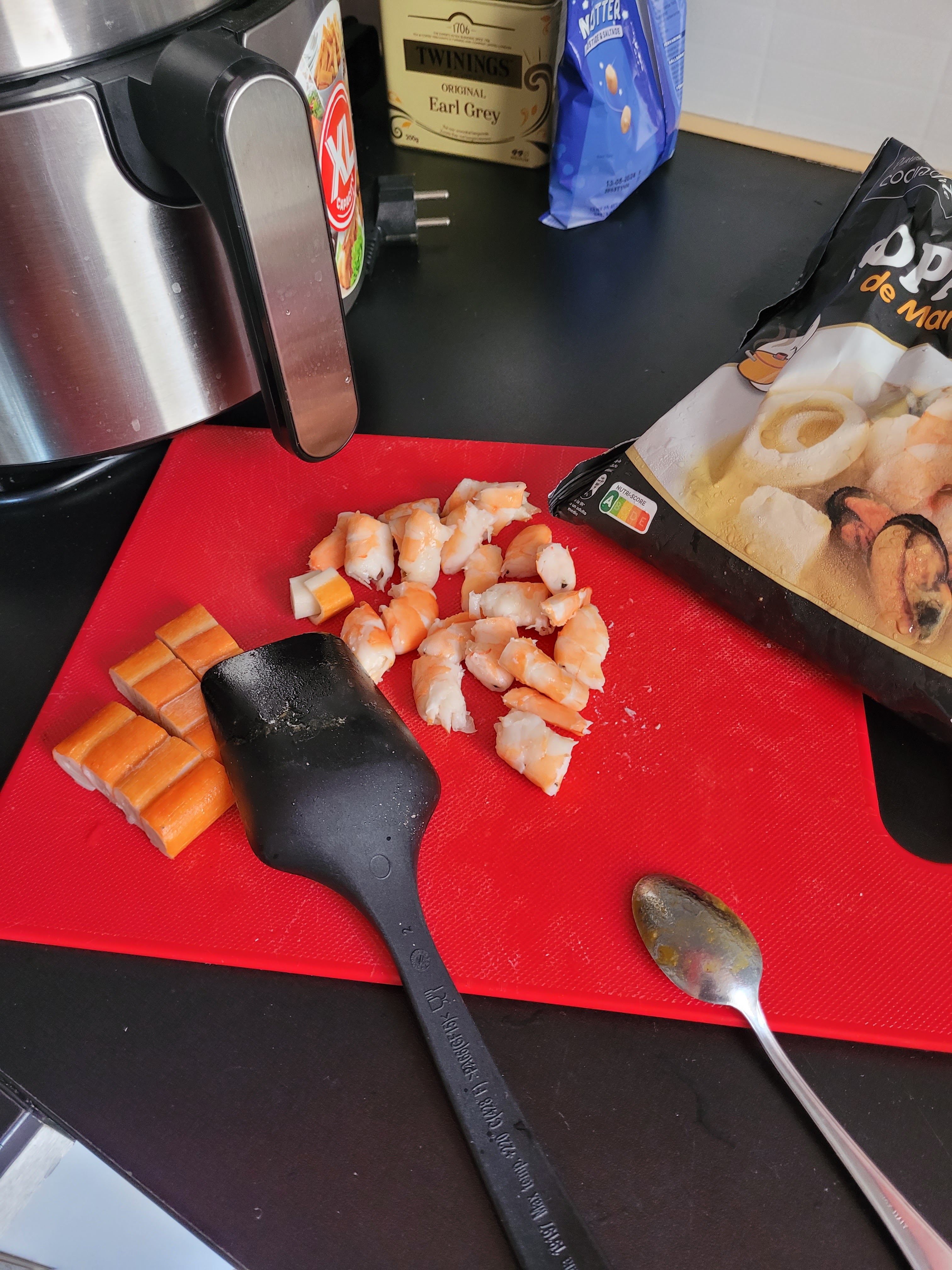 Kände mig plötsligt hungrig och började laga mat. Skivad gul lök stektes, dito ostronskivling, därefter köttfärsen som tinat, mosad med gaffel. I med delade små tomater, lök och svamp, en aning grönsaksbuljong, en aning Rajah´s hot curry paste, en aning spansk sweet chilisås. Och en skvätt vatten. Nu får det där stå till sig till senare på eftermiddagen, att ätas med tunn pasta. Före uppvärmningen lägger jag på delade små mozzarellor, hoppar över riven parmesan. Blir nog bra.