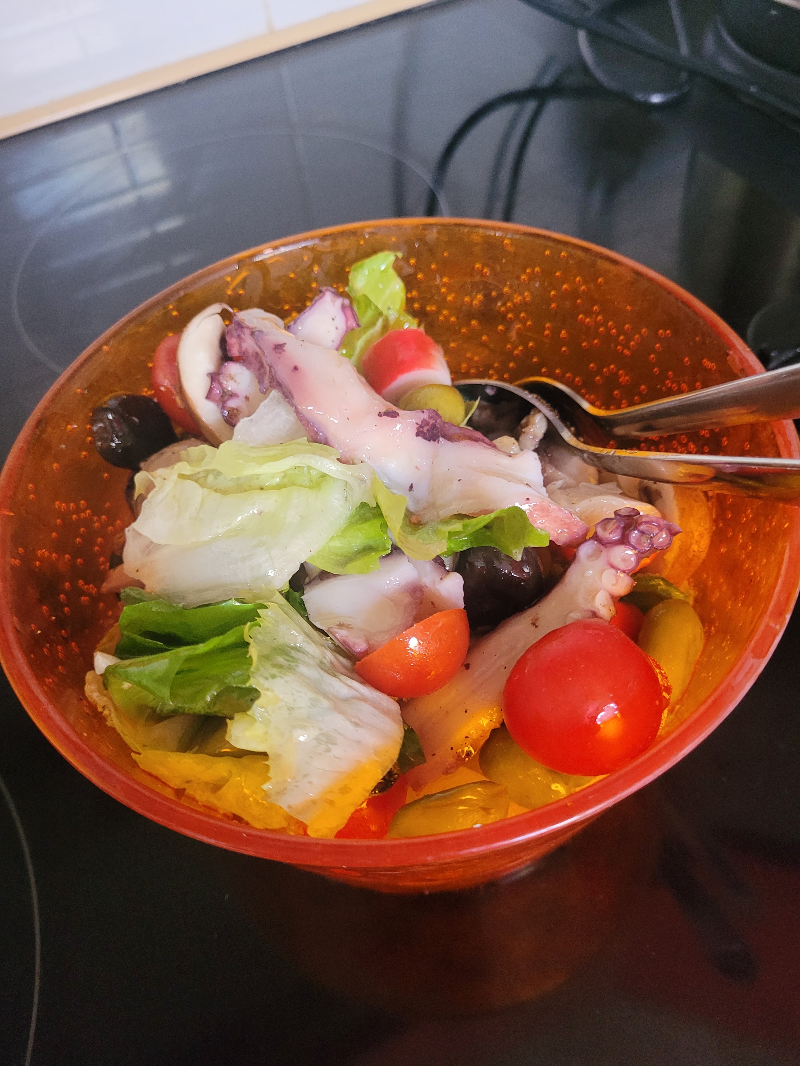 Gör i ordning min sallad till middag, pulpos med gröna och svarta oliver, gambas, musslor, små tomater, blandad sallad, råa bruna champinjoner. Lite kryddor, så är det en perfekt god måltid. Chèvre därefter, och vin därtill. Kanske bubbel som inte dracks igår.