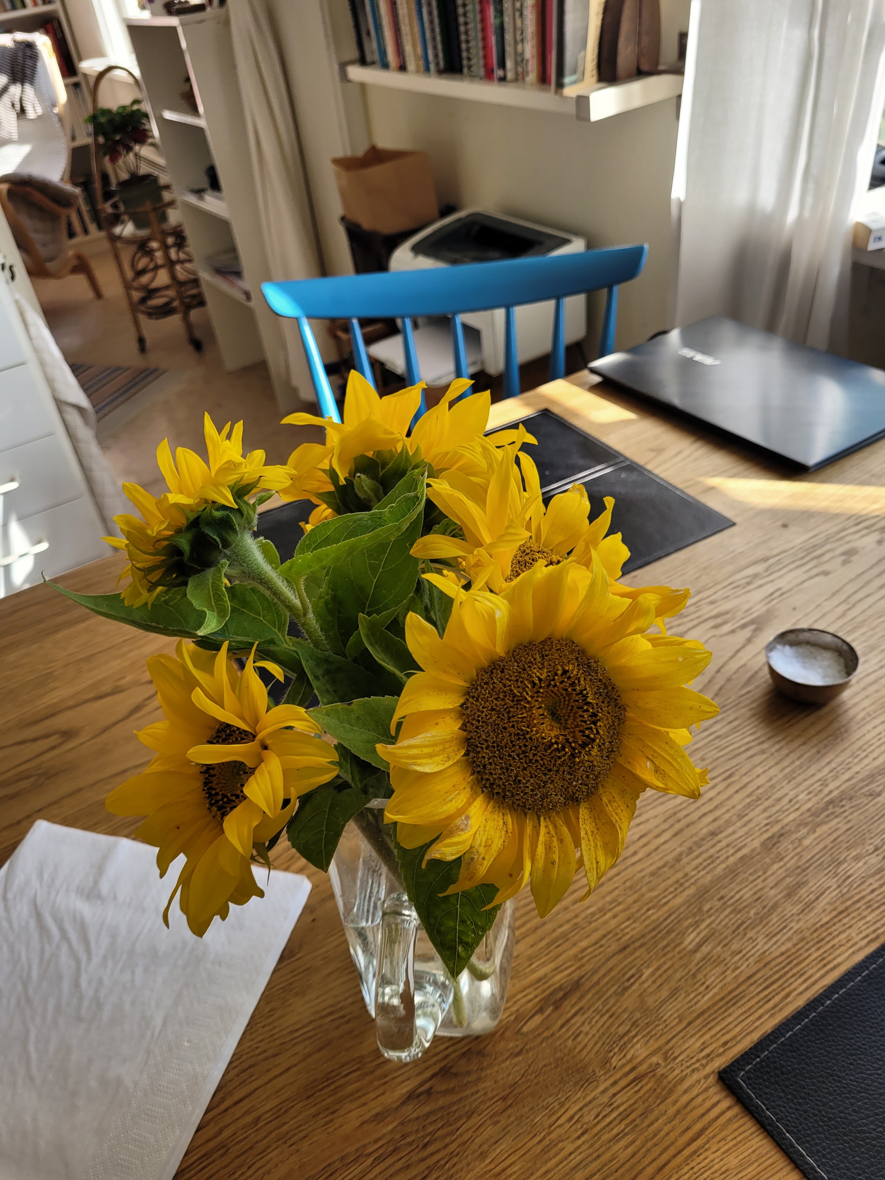 I kväll hårtvätt inför starroperation i morgon. Droppar nu båda ögonen. Och gläds åt mina solrosor, ärligt betalda för per swish.
