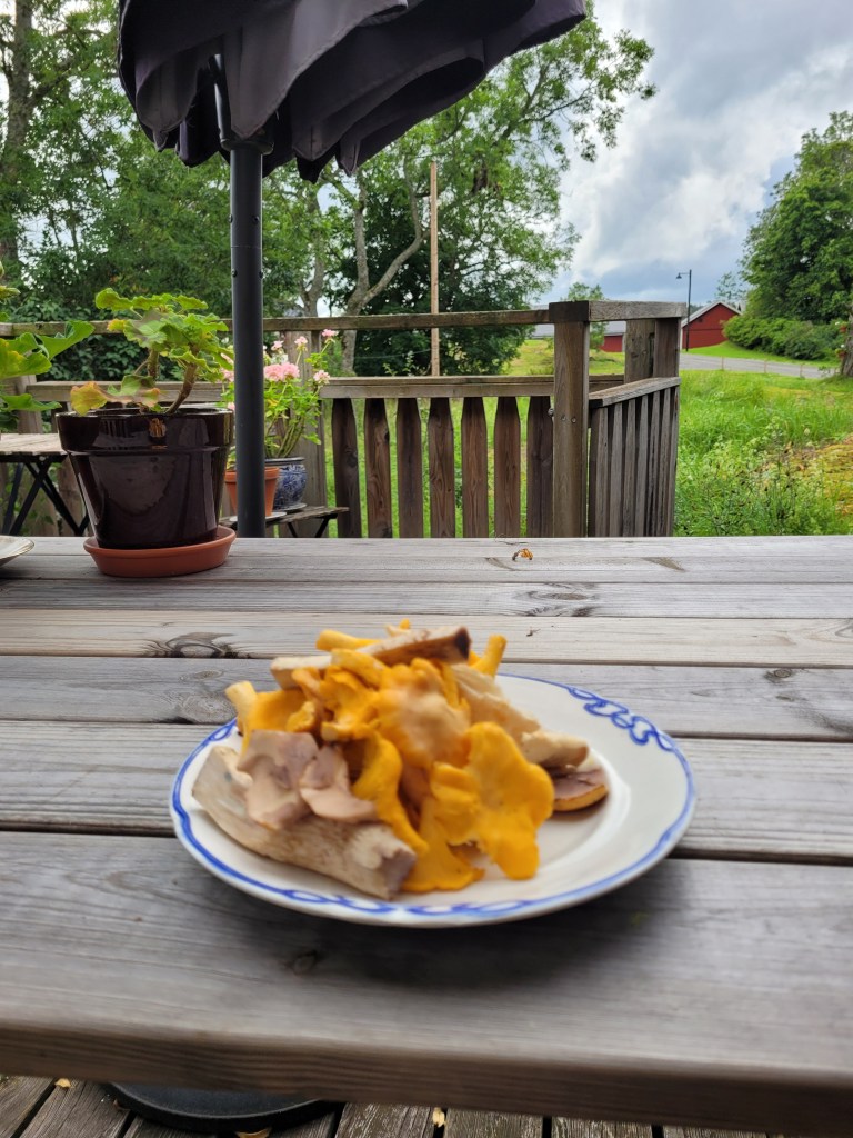 Tar bilen och åker en sväng inom gårdens område, går längs vägen och hittar kantareller direkt, plus en taggsvamp och en sopp. Räcker till en kvällsmacka någon gång. Mobilen fulladdad, GPS på. Gick lite i skogen, men insåg att jag är för ostadig på benen. Hemma igen och nu doftar det svamp i köket.