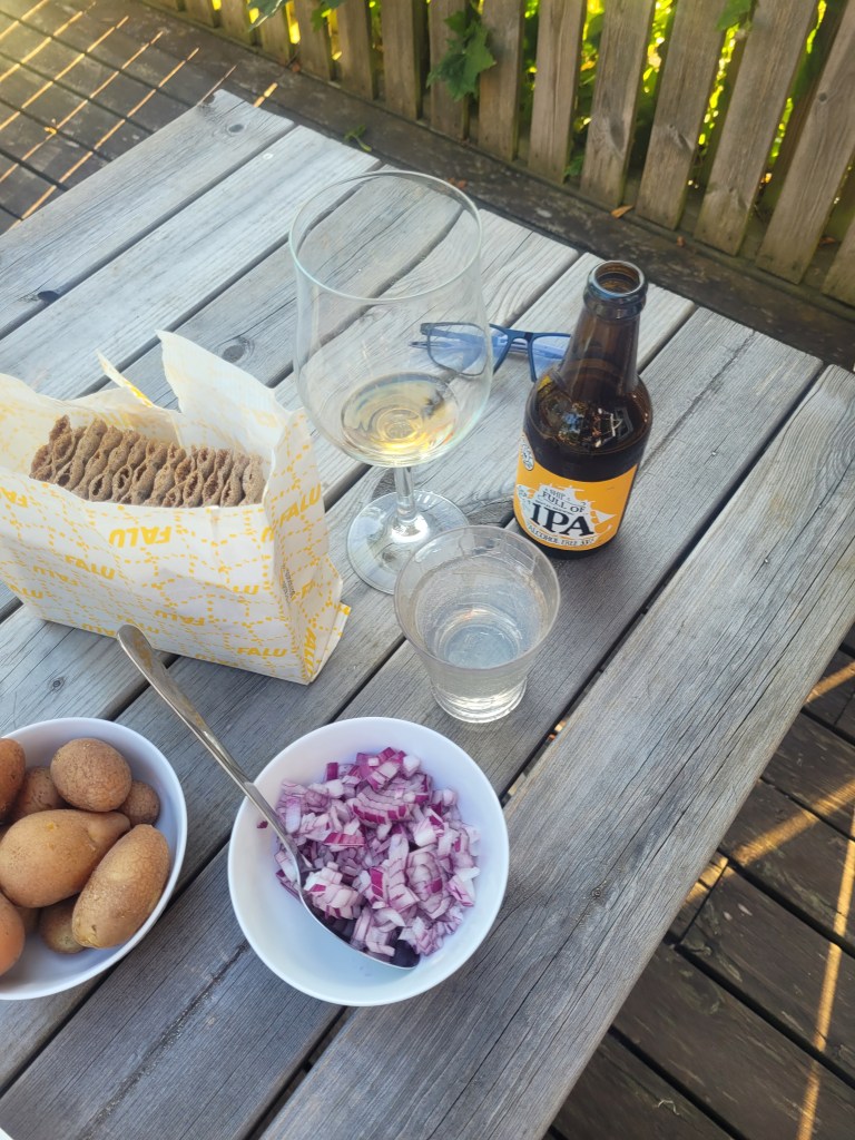 Nu mulnar det allt mer. Jag kör en tvättmaskin och hoppas på torkväder i alla fall. Mobilen säger ”regn”, jag får se när tvätten är klar. Kan ju hänga inomhus också, det är bara småtvätt. Den hänger inne, nu regnar det. När jag suttit stilla en stund ska jag kolla blodtrycket. Kokar färska rödbetor till middag, om jag ska ha något mera än Bregott till återstår att se.